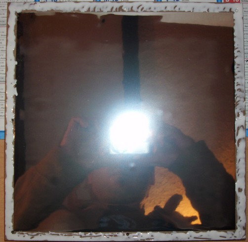 L'étanchéïté étant compromise, j'ai enlevé le silicone, j'ai passé des heures à sécher le bois au sèche-cheveux pour essayer de le faire dégonfler un peu, j'ai tout réajusté. Au final il reste que les zones qui ont gonflées donnent une parois plus bien plate sur le miroir à cause du bois gonflé par-dessous, mais je ne peux faire mieux.