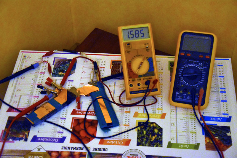 Chaque cellule est mise en // avec une autre. Il y a donc deux doubles cellules en série. J'ai mis cette fois du zinc de 1 mm d'épaisseur selon cette configuration : Cuivre, pate, zinc, pate, cuivre. Les deux cuivres sont reliés, on a donc deux cellules en //. On voit ici la tension à vide de deux cellules en série, elle est à 1.58v sur la photo. Image attachée ![]() (159.41 Ko) |