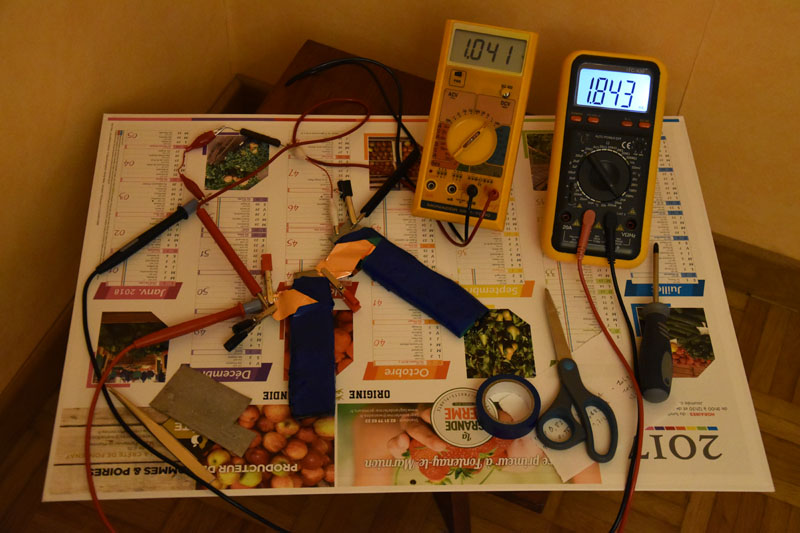 1.1 V et 2.31 mA au compteur. J'ai entouré chaque batterie d'un papier aluminium relié au moins de la batterie. Image attachée ![]() (125.45 Ko) |