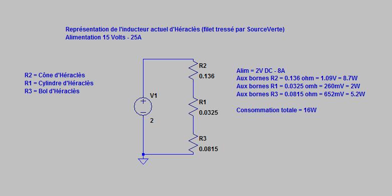 Il m’a parlé du pouvoir magnétique du bois, et du savoir-faire de nos allieux pour que lors de la construction des meubles, par exemple, les veines du bois soient orientées naturellement du bas vers le haut. Après coup, si Boutard n’en parle pas (faudra que je relise), c’est que les menuisiers de l’époque savaient reconnaitre ce genre de chose et orientaient automatiquement le fil du bois dans le bon sens. Un peu comme le maçon qui place le beau côté de la brique vers l’extérieure sans avoir un seul instant l’idée de devoir en faire mention. Hélas, je n’ai pas pris attention quand j’ai usiné le rhombe ainsi que le bol constituant Héraclès. Je pense même que le bol fut réalisé à la perpendiculaire de la veine du bois. A ce demander si les exemplaires d’Héraclès que possède Diengard ont été ouvragés dans cette philosophie conceptuelle. A l’occasion, je me rapprocherai du marchand (ancien professeur de menuiserie) qui m’a vendu le chêne pour qu’il m’en dise un peu plus à ce sujet et m’apprenne à reconnaitre le sens du bois… J’ai dit à Florent que si je dois reconstruire un nouveau rhombe, je tiendrai compte de ce paramètre, bien évidement. Comme je l’ai écrit plusieurs fois, tout a son importance pour la production du zoaire. Et quand nous voyons une production massive de laitance au bout des frises d’argent, dès la mise sous tension d’Héraclès, et ce sans détection de courant ni tension sur cette frise d’argent, tout est possible. Voilà, encore merci à Florent pour cette superbe info. Je reprendrai contact, car il aurait un ami spécialiste sur cette méthode de travail du bois. D’un autre côté, comme vous le savez, Héraclès est à nouveau chez moi. Il fonctionne mais pas très bien. Je suis désolé de ne pas avoir eu le temps de faire une analyse de la nouvelle frise fabriquée par Sourceverte, fin janvier avant de lui expédier l’engin. Aujourd’hui, c’est chose faite, je crois savoir pourquoi cela ne fonctionne pas convenablement. J’ai schématisé deux situations, l’actuelle avec le filet réalisé par SourceVerte, et celle souhaitée. Pour rappel, le filet a été confectionné avec 8 fils de +/- 3mètres en 5/10. (Contrairement à mon souhait d’opter pour un fil unique) Equivalent à 8 résistances de 0,26Ω placées en parallèle. Soit 0,0325Ω. Alors qu’un fil unique donnerait 2Ω. Sur ce premier schéma, vous pouvez constater que là où nous avons besoin de tension, nous n’obtenons que 260 mV. Trop peu pour qu’une réelle attraction s’opère de manière efficace sur l’aether. ![]() Sur ce deuxième schéma, j’ai l’intention de conserver l’enroulement du bol tel quel, modifier l’enroulement du cône en utilisant du 2,5² en lieu et place du 1,5². De plus, dès réception du cuivre nu de 5/10, je m’arrangerai pour tresser un filet inducteur pour qu’il fasse 0.13Ω. Et là avec une majorité de tension agissant sur la zone voulue, cela devrait marcher. ![]() |