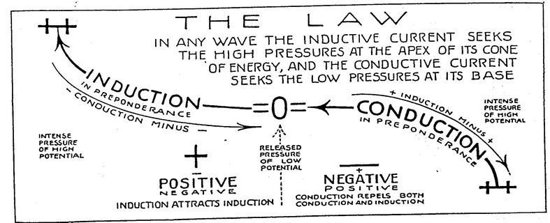 ![]() L’électricité positive est la force générée contre la résistance de la pression. Elle s’accroît avec la contraction à cause de la résistance à la pression dans les flux qui vont dans des directions opposées à elle. C’est la force d’accumulation, d’absorption, endothermique, qui cherche les plus hautes pressions. (note personnelle : car elle cherche à contenir le flux de pression pour qu’il reste sous pression) L’électricité négative est la force radiée dans la direction du mouvement produisant la pression. Elle accompagne le mouvement de pression et diminue avec l’expansion avec les flux allant dans la même direction. C’est une électricité dissipative, séparant, une force exothermique d’expansion qui recherche les plus basses pressions. L’électricité positive est la force qui s’exerce contre le flux pressant et la négative celle qui s’exerce dans le sens du flux pressant. page 12 : rien de spécial à résumer page 13 : page manquante dans le scan. Indiquée comme schéma dans la table des matières page 14 : Le processus de pensée peut se comparer à un double vortex spiral à sens opposés tournant chacun dans une demi-portion d’une sphère allongée (ellipsoïde). Ces deux spirales tournant en sens opposé représentent le mouvement du plus haut octave de la série des 10 octaves, qui est le début du cycle. Ce mouvement, dû à la pensée, est ensuite reproduit avec des périodicités variables et des complexités changeantes sur l’ensemble des 10 octaves. page 15: La pensée de la substance unique est une pensée rythmique. Le tempo de cette rythmique est absolu. L’impulsion d’action et celle de réaction du processus de pensée s’alternent et sont vus comme la génération et la radiation. Ce sont les deux forces du mouvement-en-opposition. La génération est une force attractive, positive, la force électrique et la radiation est répulsive, émanante, négative, la force magnétique.. Tout mouvement, qu’il soit en opposition ou en inertie est à l’équilibre malgré tout. Ce que veut dire ce terme est que la quantité d’énergie dépensée dans n’importe laquelle des configurations des deux fluctuations opposées du pendule cosmique est toujours identique. La variation apparente est dans la dimension des deux fluctuations opposées, est n’est pas dans la quantité d’énergie totale qui reste constante. La quantité d’énergie générative et radiative dépensées dans les deux oscillations opposées, n’importe où dans les 10 octaves, quand elles sont additionnées ensemble reste la même. Le mouvement-en-inertie est caractérisé par l’absence atomique de « valence » ou de puissance d’arrachement ou de liaison. Tous les éléments de matière en mouvement-en-opposition ont cette puissance de liaison qui varie en degré et périodicité ; ce qui est une raison supplémentaire pour séparer les gaz inertes ou tons majeurs des autres éléments. Les impulsions opposées de pensée sont engendrées depuis l’inertie, radient puis reviennent à l’inertie. Ils alternent entre la génération et la radiance en prépondérance périodique selon le ton. Les solides sont des états où il y a prépondérance de l’électrique sur le magnétique. La pensée est une action électro-génératrice et une réaction magnéto-radiative de l’esprit. page 16: La ligne d’inertie est la ligne imaginaire de non-opposition absolue entre les oscillations des deux forces opposées en mouvement. On suit le mouvement dans son retour vers cette ligne : sur la ligne les 2 forces sont neutralisées et en équilibre : il n’y a aucune force de rappel de mouvement qui s’exerce sur la ligne mais il y a quand même la pulsation magnétique radiative qui continue son mouvement à travers la ligne, sans aucune force. Après avoir traversé la ligne, le mouvement se poursuit donc par une pulsation électro-générative jusqu’à ce que la force magnétique cause un rebond dans l’autre sens. Cette ligne inertielle est ce qui est appelé le « point mort « entre forces en mécanique, où aucune force d’inertie n’existe. (note personnelle : c’est ce qui se passe pour un ressort suspendu et non étiré : il est au repos, aucune force ne le comprime et aucune force ne l’étire ; puis si on met une impulsion dans un sens ou l’autre alors il se met à osciller. Pour un ressort qui n’aurait aucun frottement nulle part, l’oscillation continuerait éternellement. On passe par un point neutre où la force de rappel ou de compression sont nulles, mais par sa vitesse le ressort continue son mouvement, créant une nouvelle impulsion dans le sens ou de la compression si on venait de l’étirement ou inversement, etc) Le mouvement est continu, comme la pensée. L’univers respire, inhale et exhale, comme l’homme respire ; et chaque unité de lumière, atome et molécule respire. L’opposition des deux forces apparemment opposées cause des impulsions opposées qui forment des ondes spirales le long desquelles l’idée produite par la pensée est enregistrée. Cette idée enregistrée s’appelle un « élément de matière » quand elle est enregistrée gravitationnellement et s’appelle « flux magnétique ou lignes de forces magnétiques » quand elle est enregistrée répulsivement. Ce sont des expressions de la même force selon la direction dans laquelle elle s’exerce. L’électricité génératrice est centripète et sa direction est vers le centre nucléaire en spirale fermante. Le magnétisme radiatif est centrifuge et sa direction est vers l’extérieur du centre en spirale ouverte. Chacune des forces finit toujours par devenir l’autre et chacune est la cause de l’autre. La radio-activité (radiativité) est une diminution du potentiel vers les plus hautes octaves des éléments de plus grande vitesse mais de moins de puissance. La généro-activité est l’accroissement du potentiel vers 
