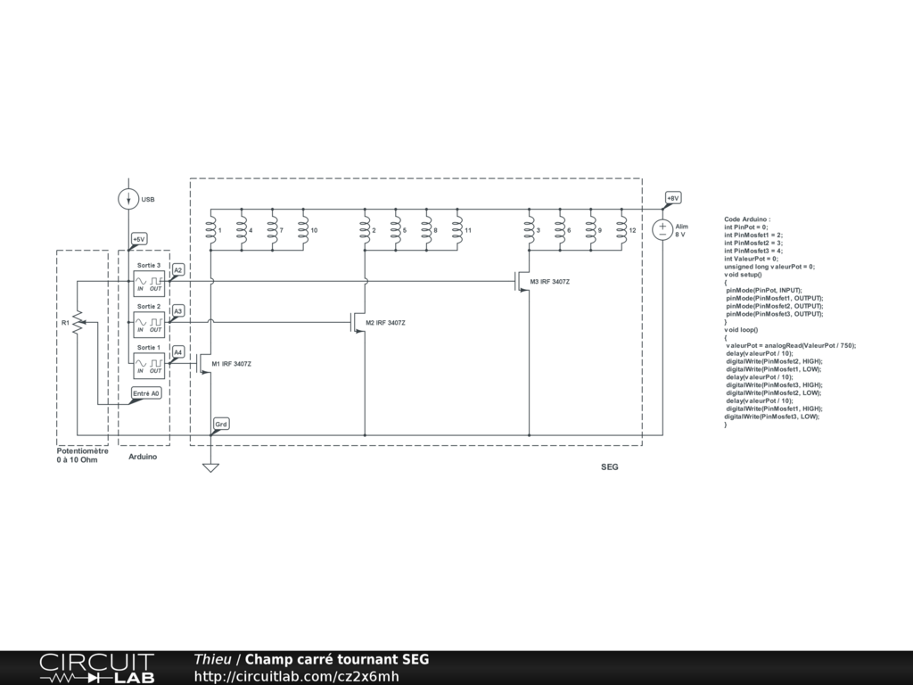 En fait je cherche à le faire tourner en mode "moteur", en controlant la vitesse par variation de longueur de pulse, puis quand le mouvement sera stable et continue, supprimer l'alimentation de plusieurs bobine avec les interrupteurs et tenter d'en récupérer l'énergie Mais J'avance en mode "step by step", en tâtonnant, puisque je (re)découvre les joies et contraintes de l'électronique, et de l'expérimentation de manière générale... J'ai fait d'autres essais en raccordant le Mofset sur l'alimentation des 12 bobines, et le résultant est très décevant 2 facteurs rentrent en compte, -la température de fonctionnent des bobines et du Mofset, le mouvement est plus franc à chaud mais pas pour autant "rotatif", -la tension d'alimentation, le Mofset que j'ai mis ne doit pas avoir le temps d'ouverture suffisant puisque j'ai une chute de tension important, je mesure 1,65v aux bornes des bobines pour 5V sur l'alimentation, qui n'est pas que la conséquence de la loi des noeuds puisque j'ai 3v pour 5v lorsque j'alimente qu'une seul bobines. En Vidéo : à froid On entends à 1:23 un claquement à chaque pulse dans les bobines, (on l'entend très bien aussi dans CELLE LA) : à chaud et en jouant avec les interrupteurs pour tenter de créer le mouvement, juste avant que le Mofset ne claque (reste constamment ouvert) : Plus ça va, plus je me dit que forcer la fréquence des pulses n'est peux être pas la bonne solution Peut être en modifiant les periodes de pulses ?, actuellement je suis à 50% activé 50% au repos, seule la longueur de période se modifie avec le potentiomètre Je vais voir pour un nouveau code... Thieu |